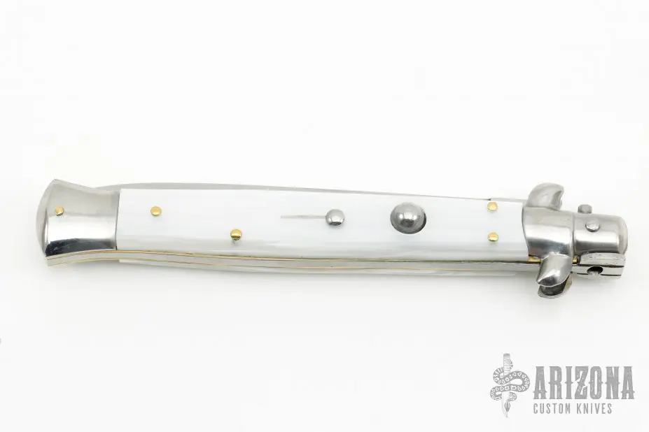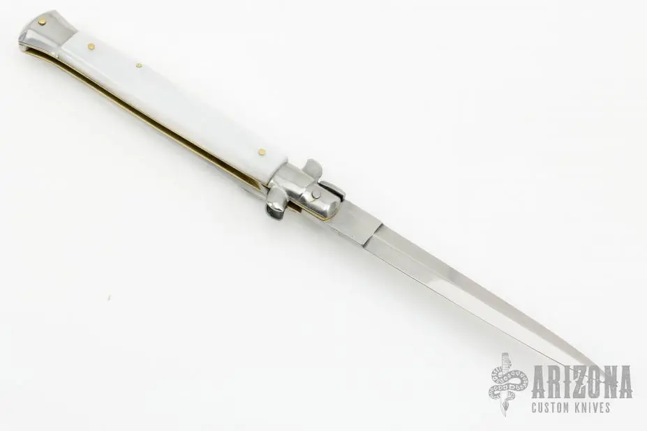 This 11″ Picklock features a tumbled blade with false top edge. The handle has stainless steel bolsters, front and rear, acrylic scales, brass liners, stainless spring. Has a few light scratches, otherwise excellent condition.