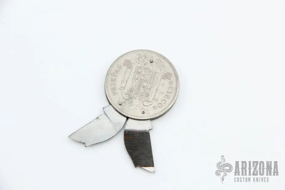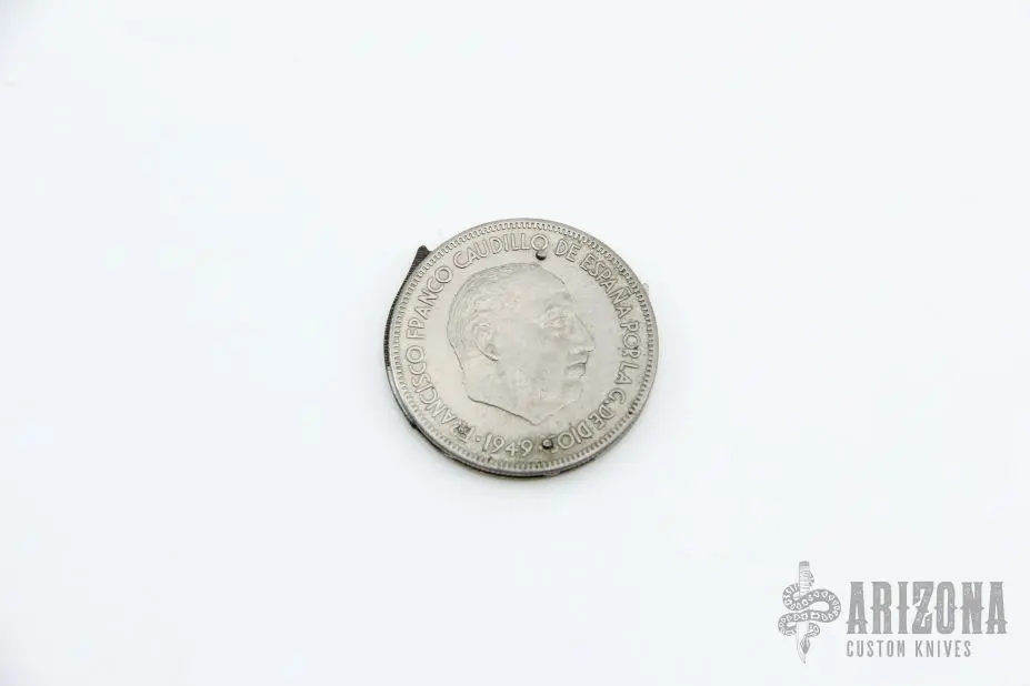This coin knife is made from an 1949 French coin by Paya in Spain. Has a satin blade, nail file. Has some scratches and patina, otherwise good condition for its age.