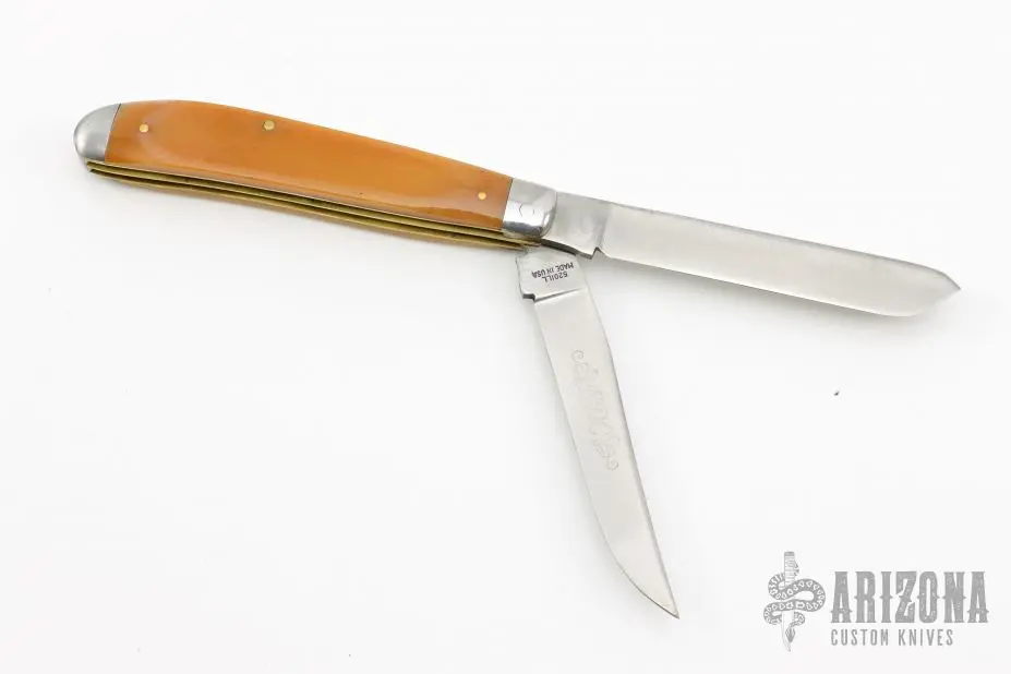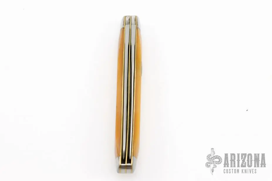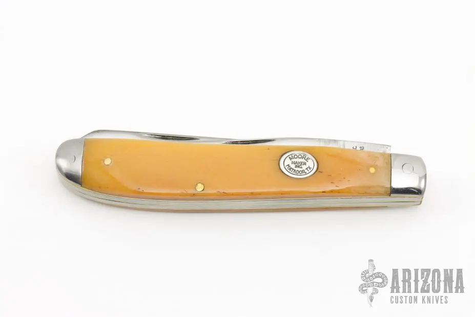 This slipjoint by Maker Moore features satin finished blades with nail nicks. The handle has stainless steel bolsters, yellow bone covers with nickel silver escutcheon, brass liners and stainless steel springs. Has a few light scratches, otherwise excellent condition.