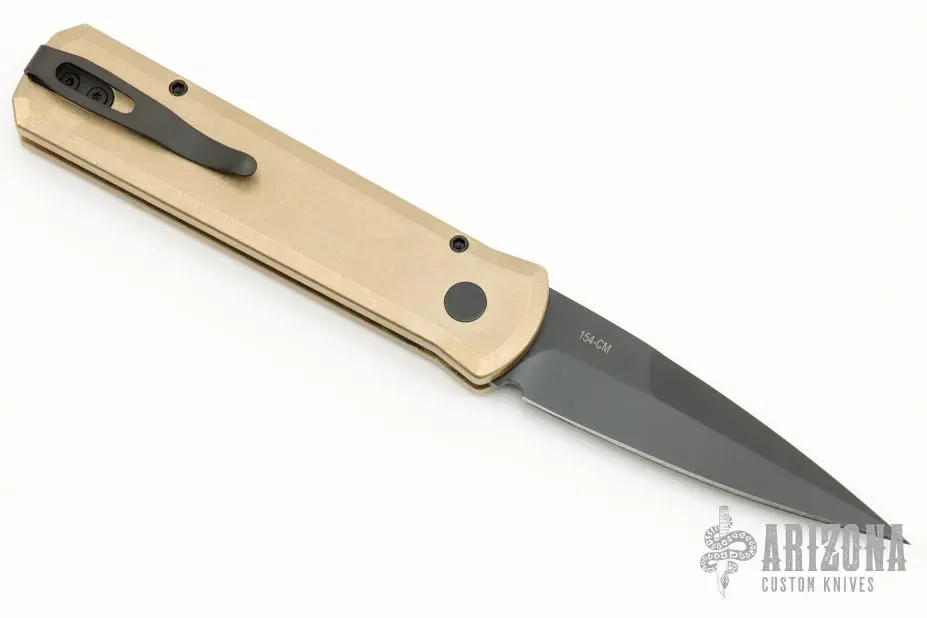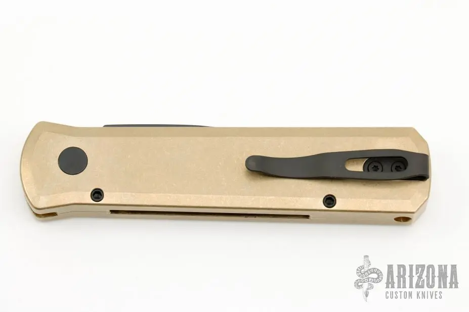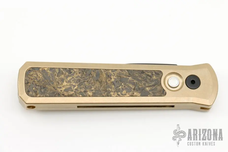 This Godson from Pro-Tech Knives features a black blade with swedge. The handle has a bronzed aluminum frame with a pearl push button, black tip up clip. Â Dark Matter Gold FatCarbon inlay. New From Maker!Â