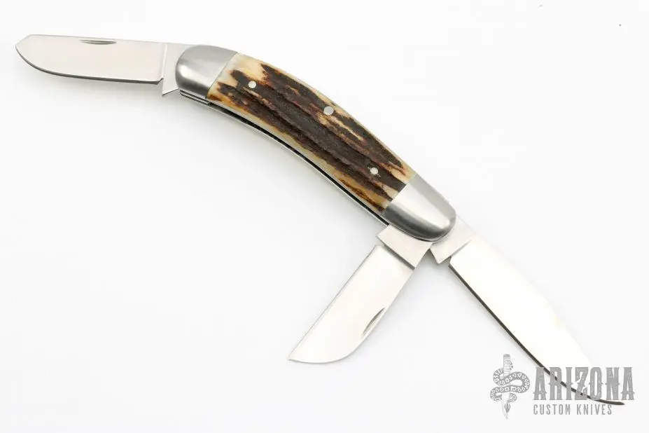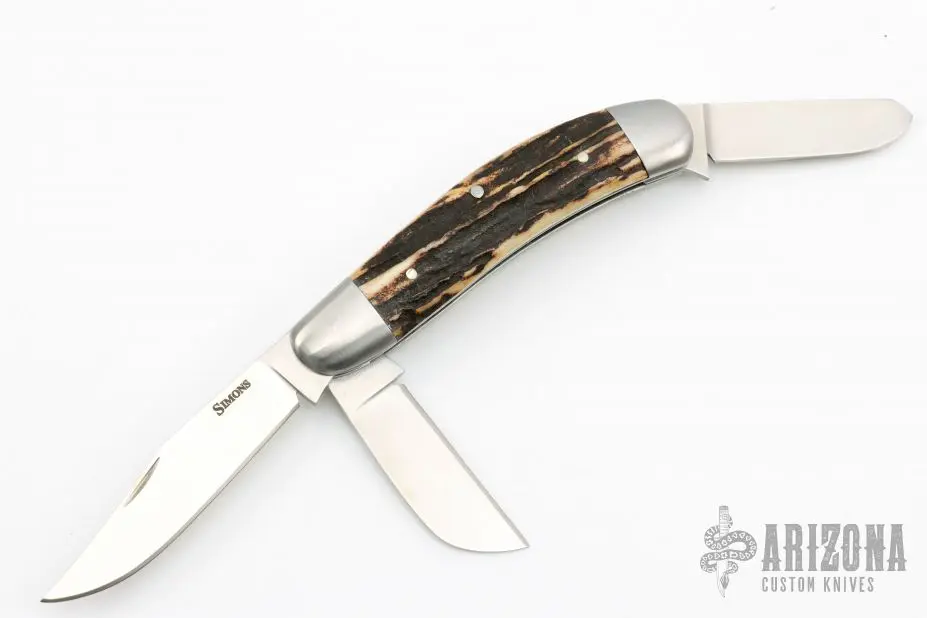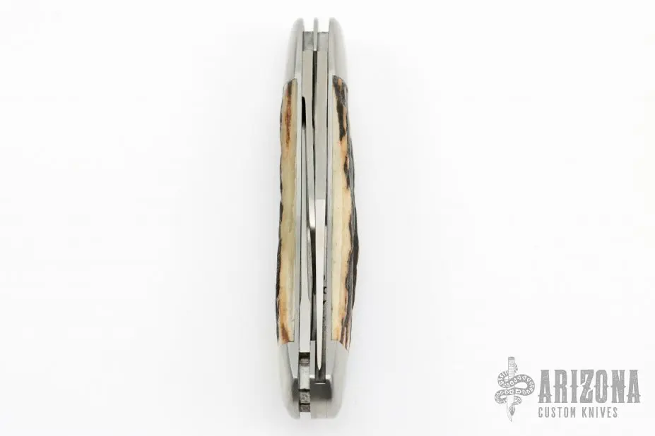 This slipjoint by Bill Simons features satin finished blades with nail nicks. The handle has stainless steel bolsters, stag covers, stainless steel liners and stainless steel springs. #406 inside the spring. Comes with a zippered case. Excellent condition.