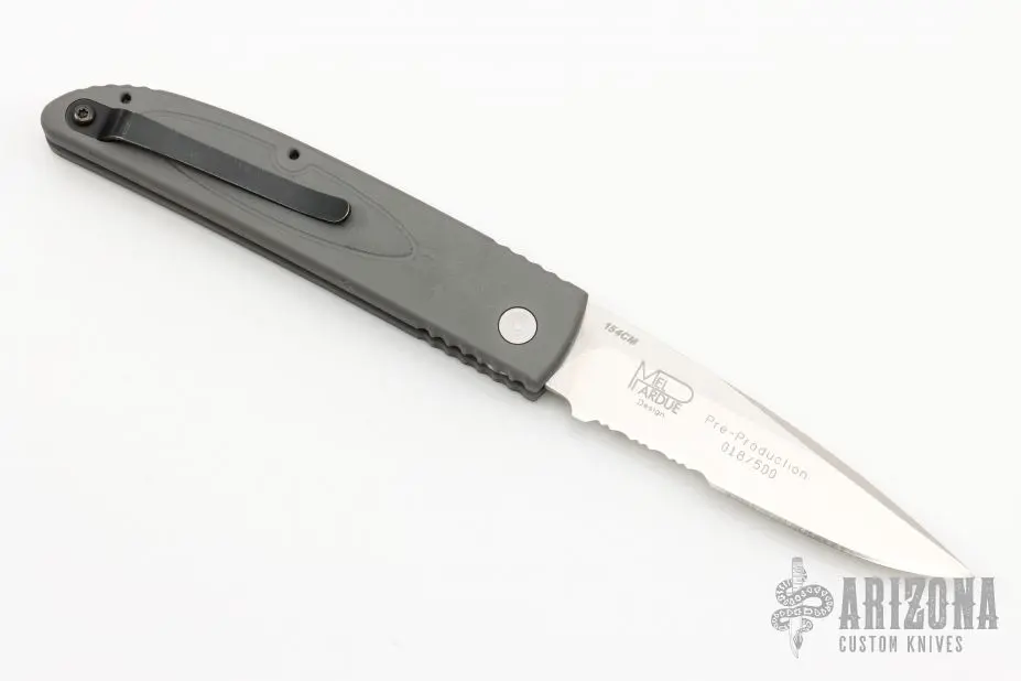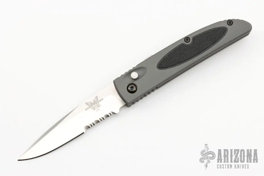The Benchmade 3200 automatic is a Mel Pardue design. Side opening, coil spring. Satin finish blade. Black coated stainless steel clip. Sliding safety. Has some light scuffs, great condition otherwise.Â