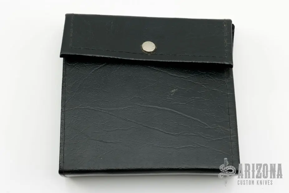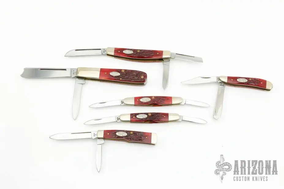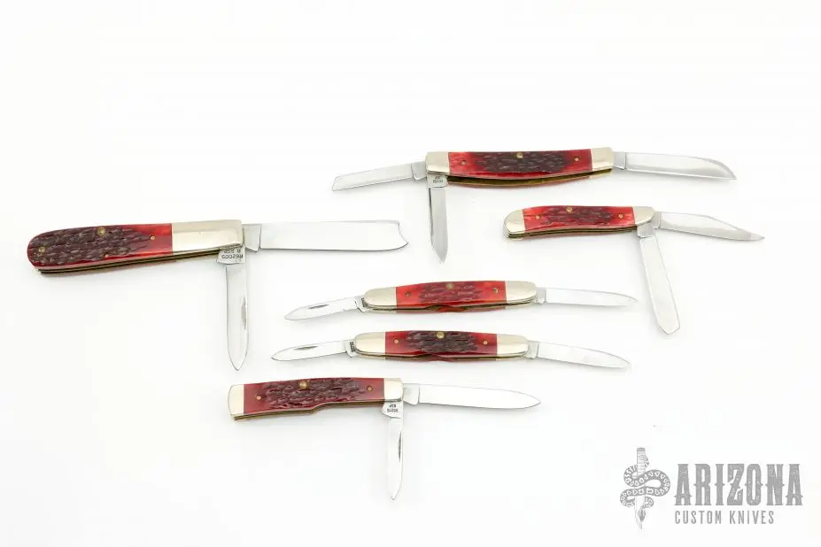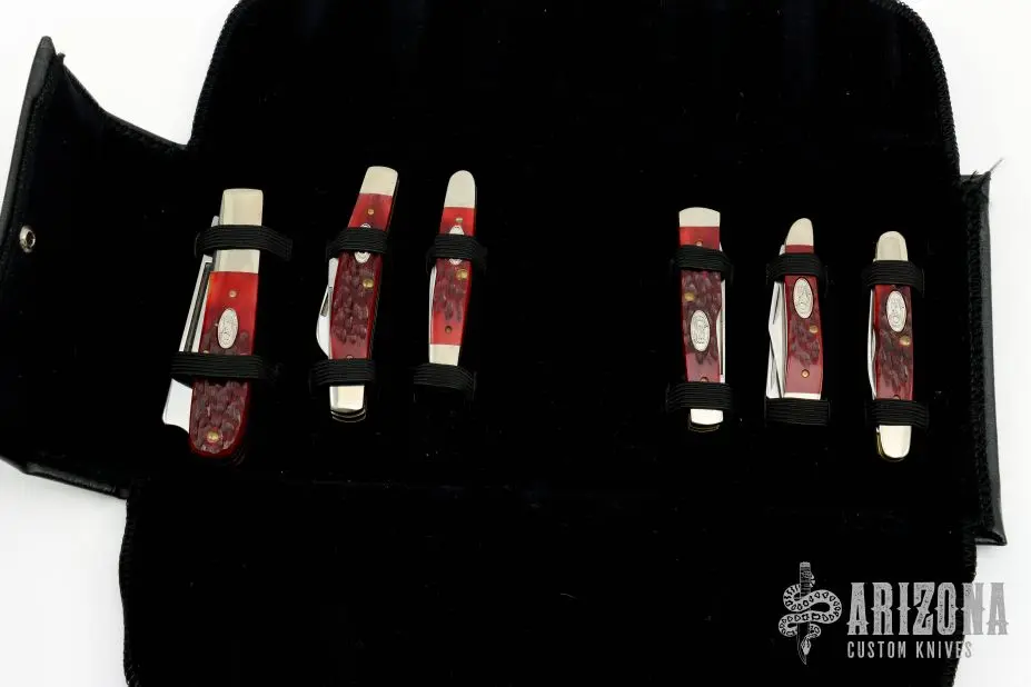 These knives all have mirror polished blades with single nail nicks. Â The handles have nickle silver bolsters abd red jigged bone covers over brass liners. Â Includes a black leather case. Â Excellent condition. Â