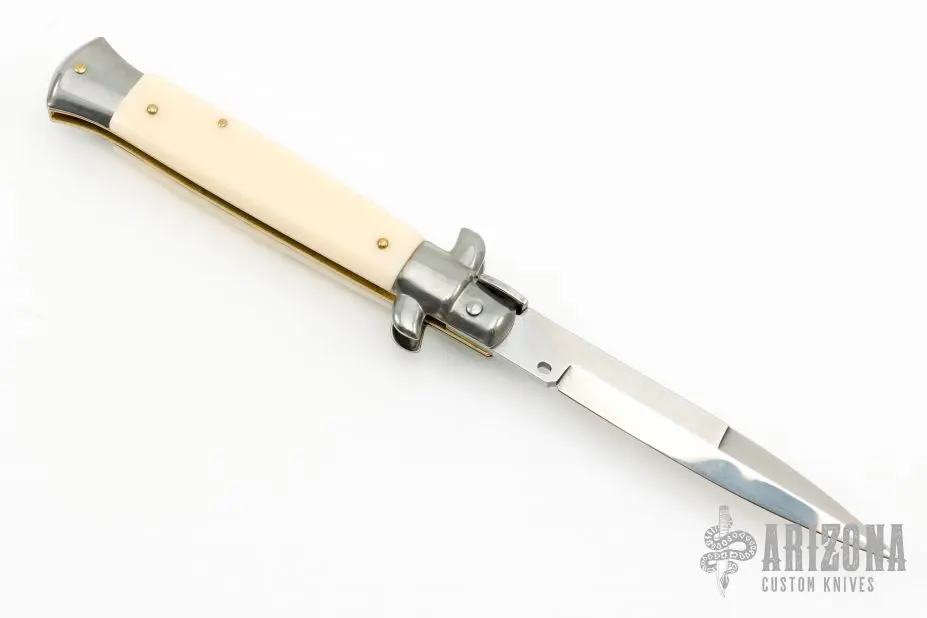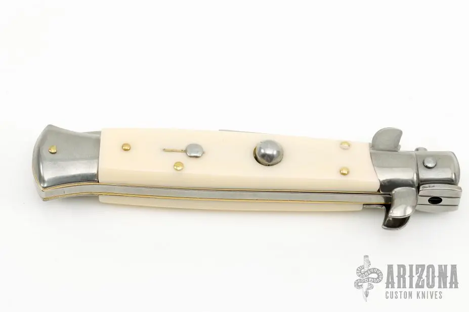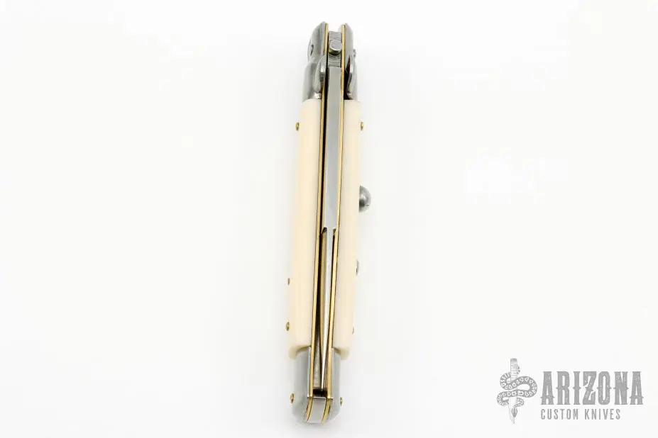 This 9″ Picklock by Frank Beltrame features a polished bayonet ground 4mm blade with false top edge. The handle has stainless steel bolsters, front and rear, imitation ivory scales, brass liners, stainless spring. Excellent condition.