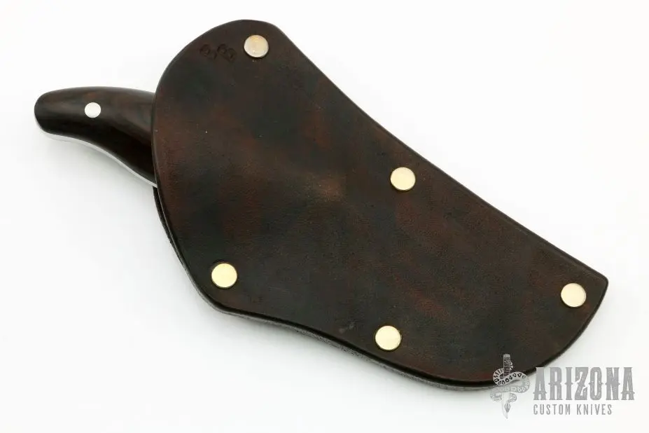 This Hunter/Skinner by Josh Botelho features a satin finished hollow ground blade with .184″ blade stock and 1.225″ blade depth, full tang construction. The handle has African Blackwood scales with stainless pins. Comes with a brown leather sheath. New from maker.