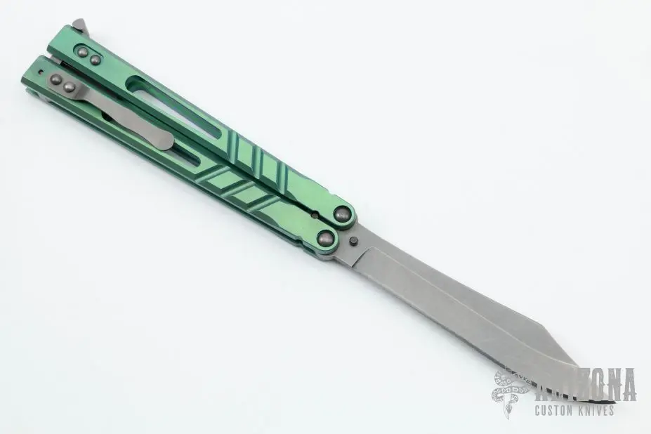 This Alpha Beast Balisong 3.0 from Blade Runner Systems (BRS) features a tumble finished clip point blade. The handle is milled and tumbled titanium with T latch on pommel. Excellent condition. Comes with original box and papers.