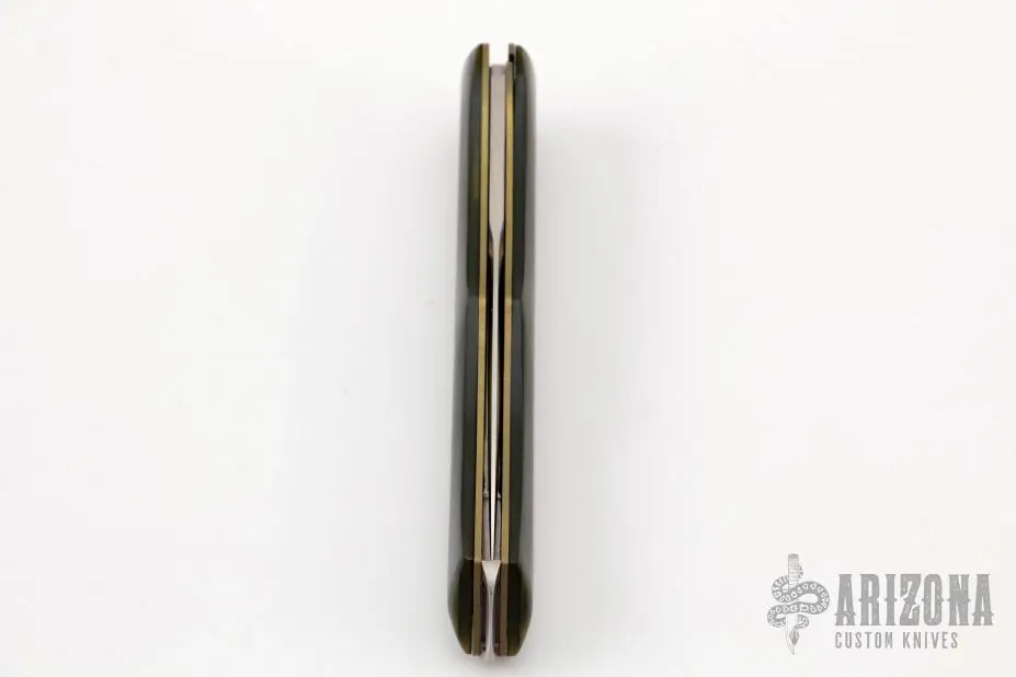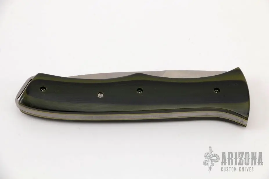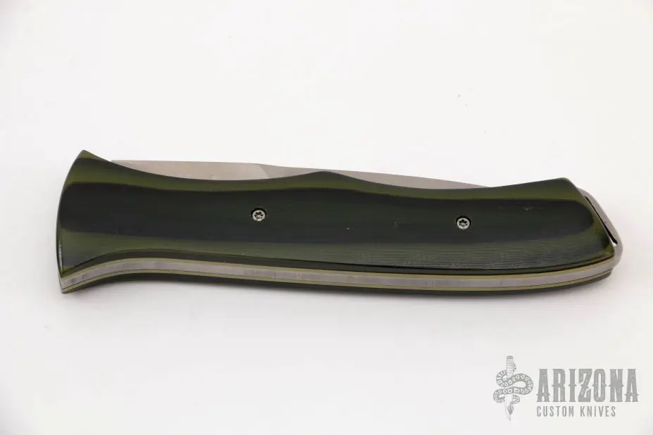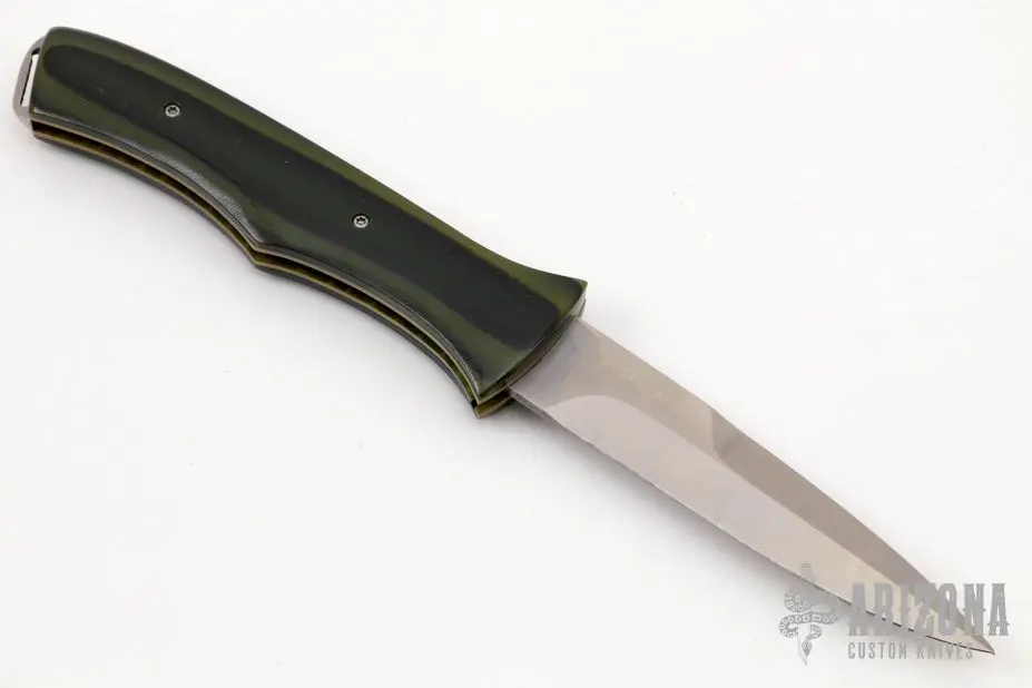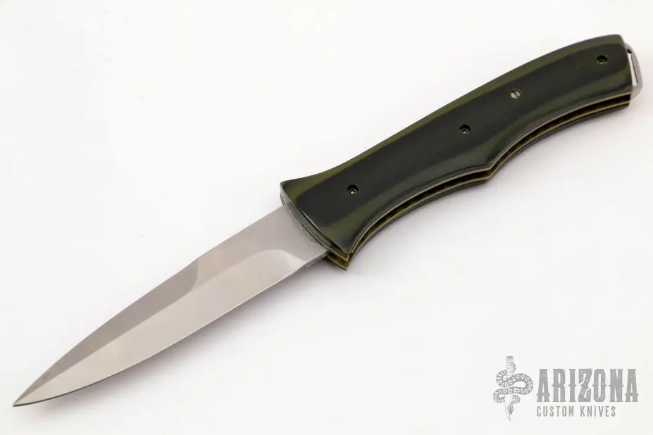 This left-handed scale-release automatic by Rainy Vallotton features a satin finish blade with false top edge. The handle has black/green G-10 scales, anodized titanium liners, stainless steel backspacer. Strong and fast leaf-spring opening. #14 on blade. Excellent condition.