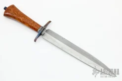 This Baby folder by Bob Terzuola features a Damascus blade with single thumbstud. The handle has a bead blasted and anodized titanium frame and liners with an anodized titanium backspacer and ironwood  scales. Comes with a zippered case. Has a couple light scuffs, otherwise excellent condition.
