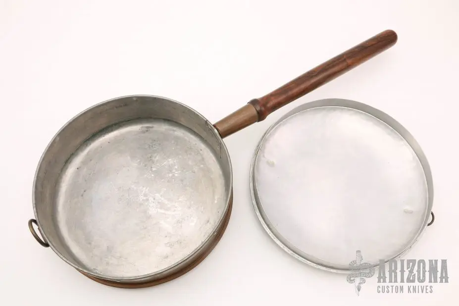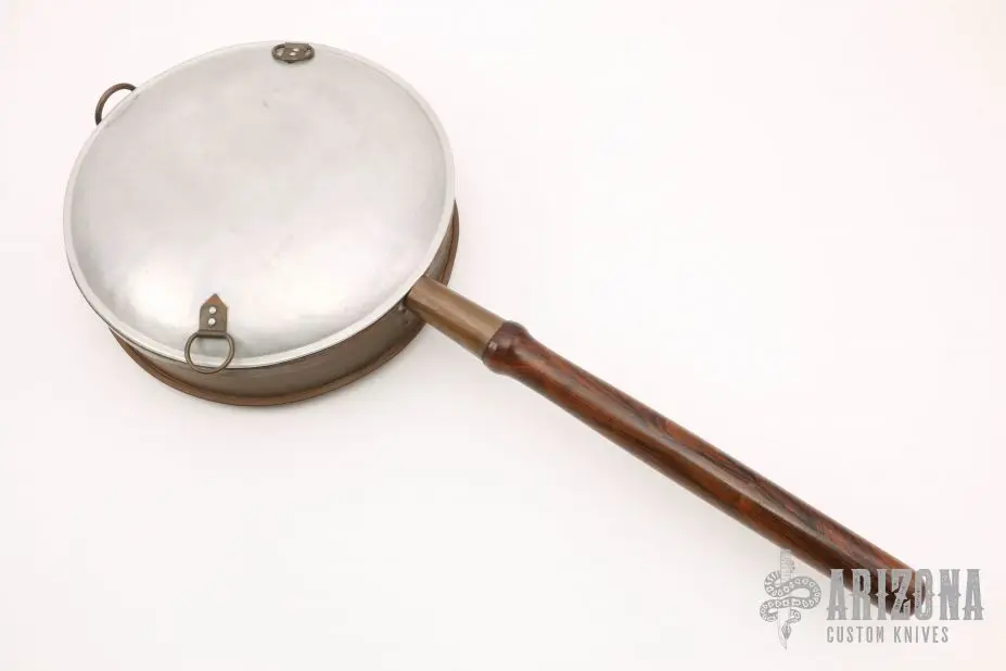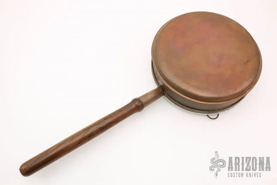 This Bed Warmer or Dutch Oven (we aren’t really sure exactly what it is) by William Scagel was acquired by Herman Schneider through his friendship with Dr. Lucy, who was William Scagel’s personal physician and a major collector of his work. It is made of copper and aluminum with a wooden handle. It has never been used and is in excellent condition. His makers mark is stamped on the ring on the front of it. Pot is 11″ in diameter.