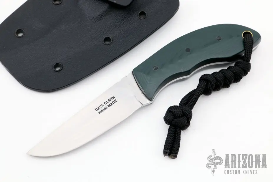 This knife by David Lancaster Clark features a hand rub satin finished blade with notched thumbrest, .096″ blade stock and .931″ blade depth, full tang construction with green  G-10 scales. Comes with a kydex sheath. New from maker.