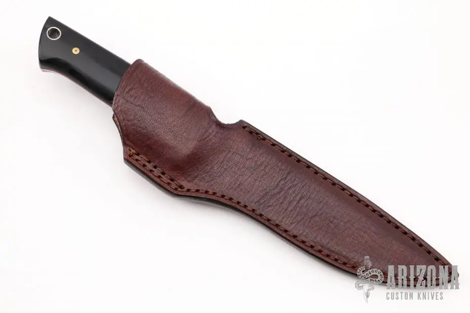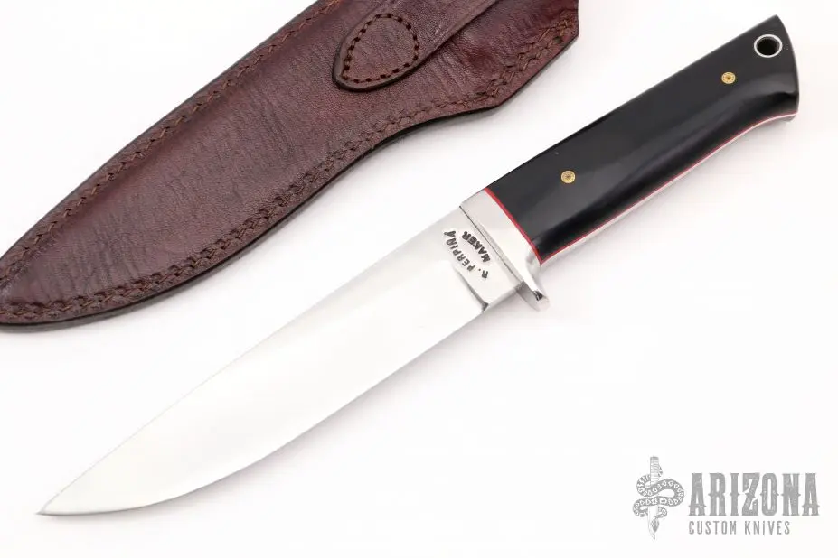This Hunter from Ricardo Perpina features a satin finish blade with .192″ blade stock and 1.208″ blade depth, full tapered tang construction. The handle has a stainless steel guard with black paper micarta scales and red liners. Coems with a brown leather sheath. New from maker.