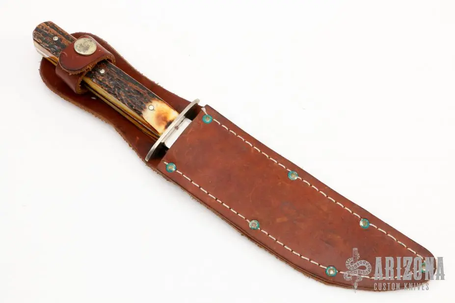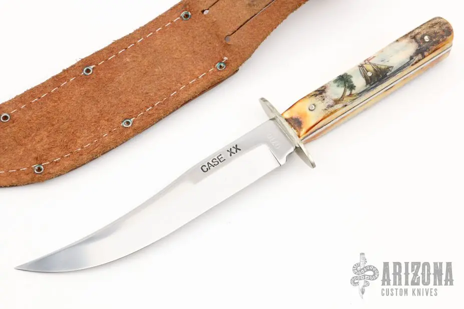 This Hunters Bowie from Case Knives features a mirror polished blade with false top edge, .097″ blade stock and .975″ blade depth, full tang construction. The handle has a nickel silver guard, stag scales. The scales have scrimshaw. Includes original brown leather sheath. Excellent condition. #0710