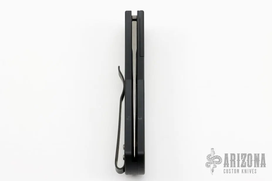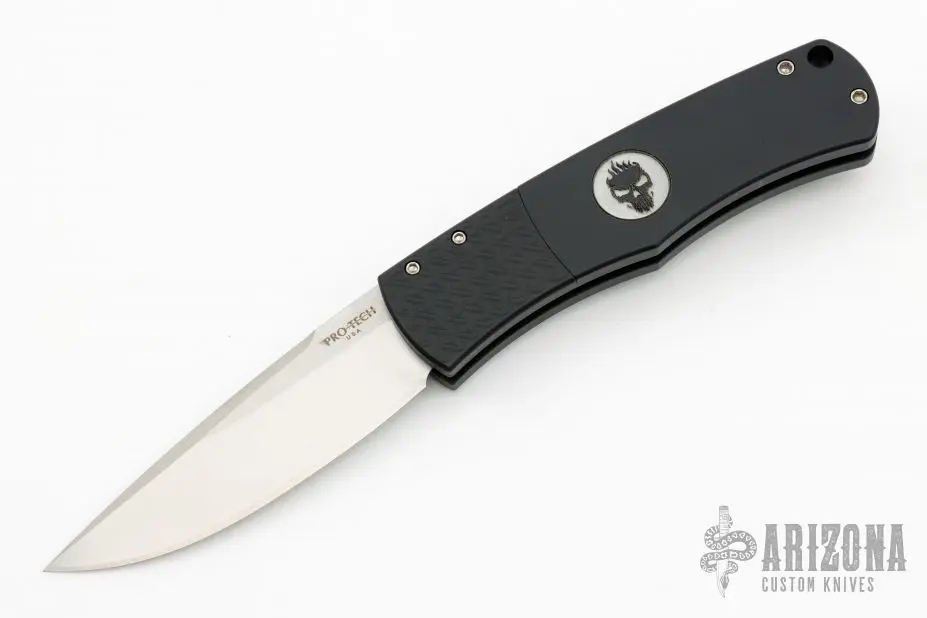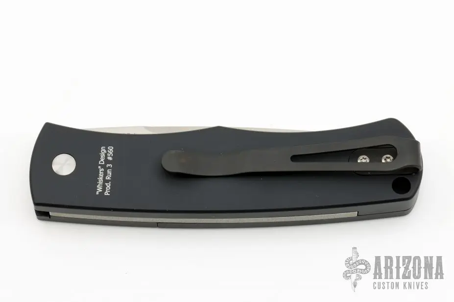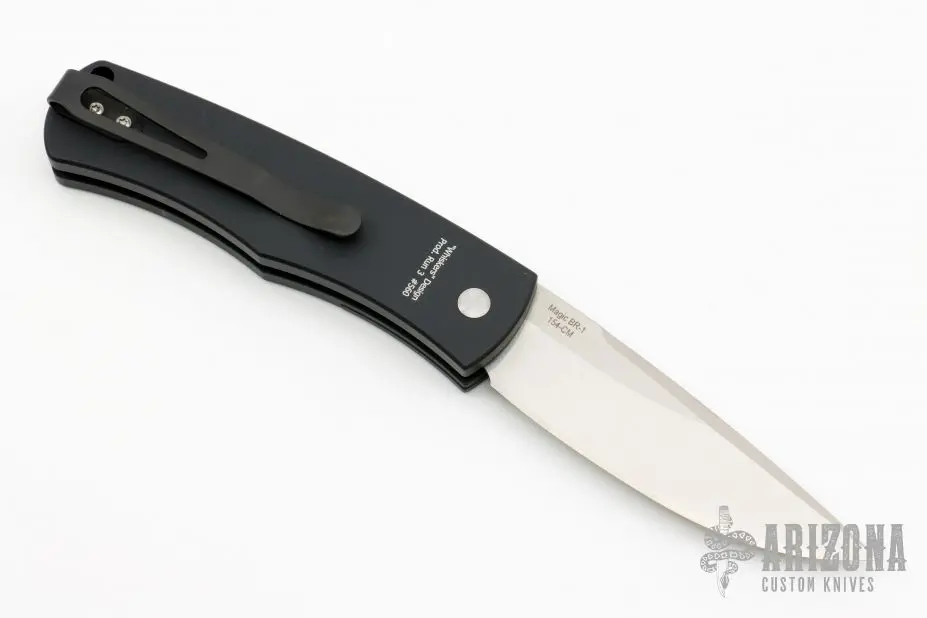 This Magic BR-1 Bolster Release Automatic from Pro-Tech Knives features a drop point stonewashed 154-CM blade with swedge. The handle has a black aluminum frame with checkered bolster. “Whiskers” Design Prod. Run 3 #560. Black coated stainless steel clip is positioned for tip up carry. Lanyard hole in the pommel. Excellent condition.