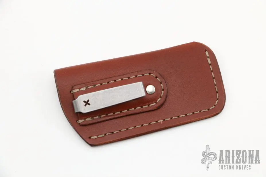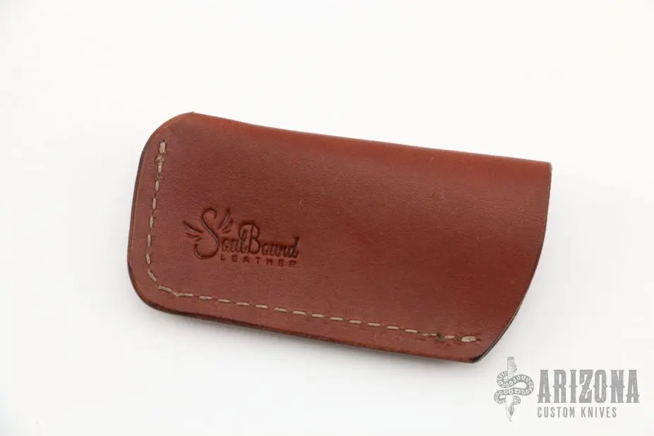 This Brown leather sheath by SoulBound Leather is made from premium full grain English Bridle Leather from Wickett & Craig and has a stainless steel pocket clip. New from maker. 3.5″ tall and 1.5″ wide.