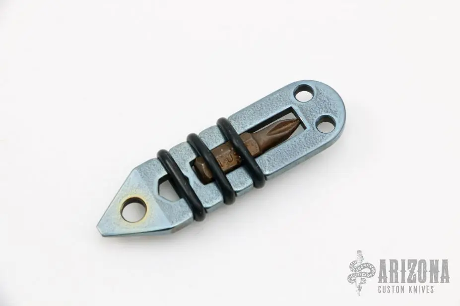 “Made of aircraft grade 6AL4V titanium, this unique multitool features a 1/4″ hex driver bit with hex bit holder and O-ring retention system, 1/4″ wrench and screwdriver/pry tip. Also makes a great key fob.” Stonewashed and anodized 6AL4V titanium. Excellent condition. Â Comes with original bag and card.