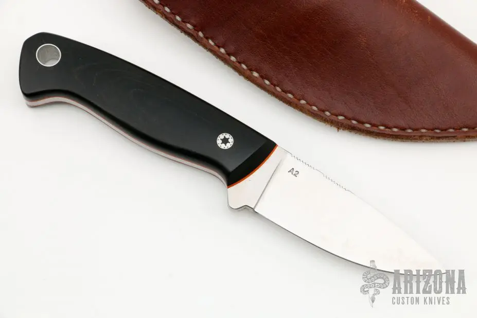 This Bushcraft from Tom Krein features a satin finished blade with full flat grind and notched thumbrest, .178″ blade stock and 1.080″ blade depth, full tang construction. The handle has black linen micarta scales with orange liners, mosaic pin and lanyard hole. Includes brown leather sheath. Excellent Condition. Â