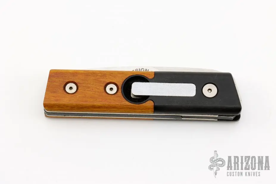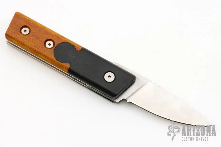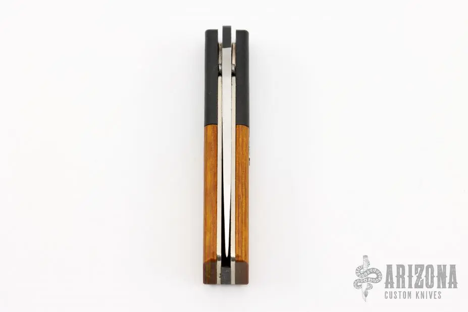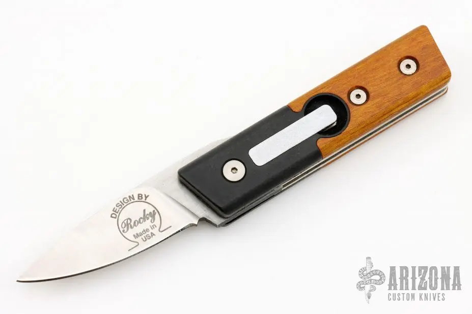 This California Auto by Rocky Enterprises features a satin finished drop point blade. The handle is comprised of black bolsters and wood scales over steel liners and black backspacer. Includes original box. Excellent condition.