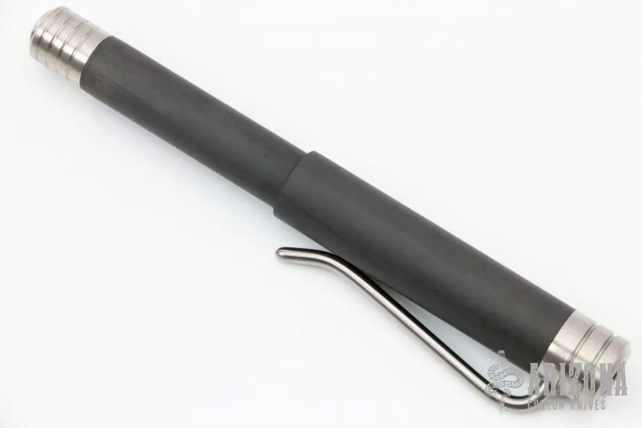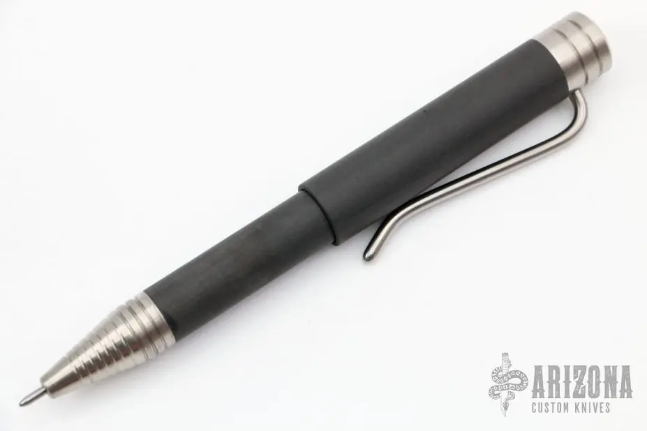 This pen by Warren Thomas is made from carbon fiber and aluminum . The butt of the pen unscrews and has a titanium spike. Excellent condition.