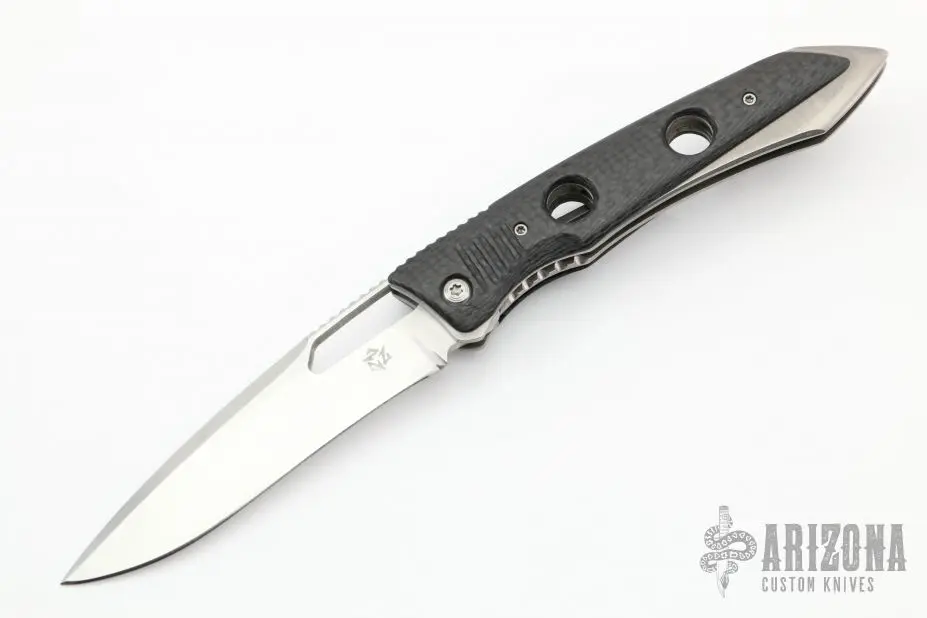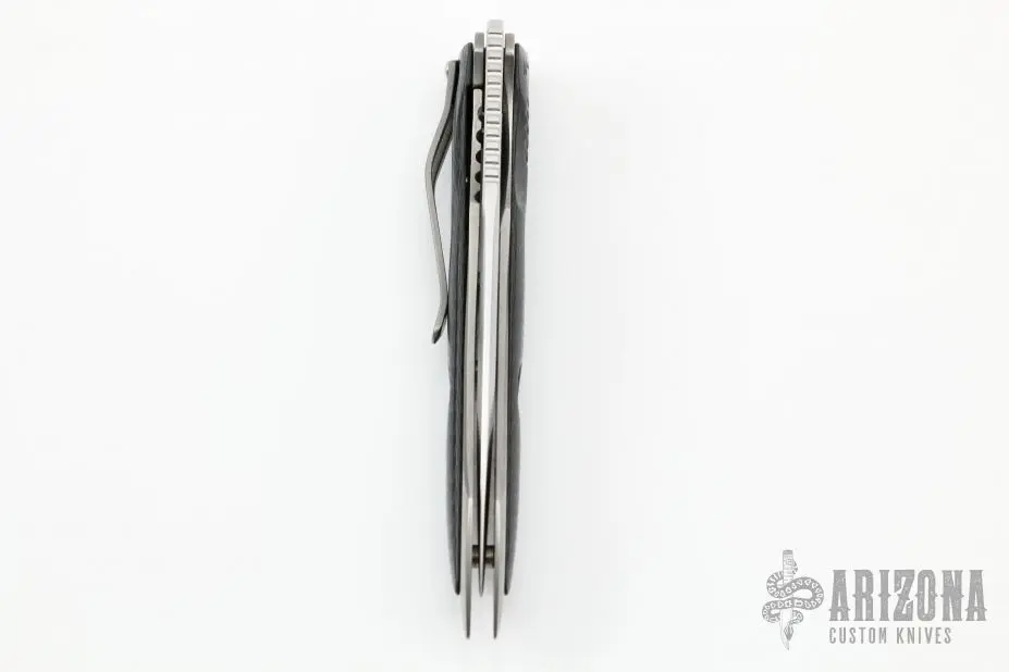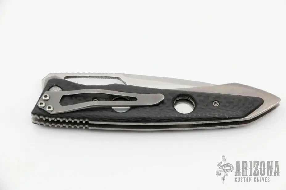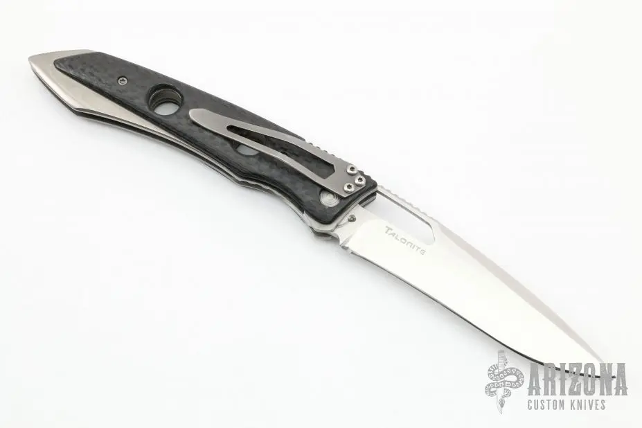 This Deryk Munroe Chimera features a tumble finished Talonite blade with thumb hole and notched thumbrest. The handle has carbon fiber scales with tumbled titanium liners and a matching tip down pocket clip. Strong lock up, nice detent and blade seating is center. Excellent condition.