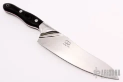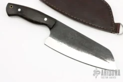 This Chopper Cleaver by MA Knives features a mirror finished blade with forge finished flats, .108″ blade stock and 2.823″ blade depth, full tang construction. The handle has dark wood scales with aluminum pins. Comes with a brown leather sheath. New from maker.