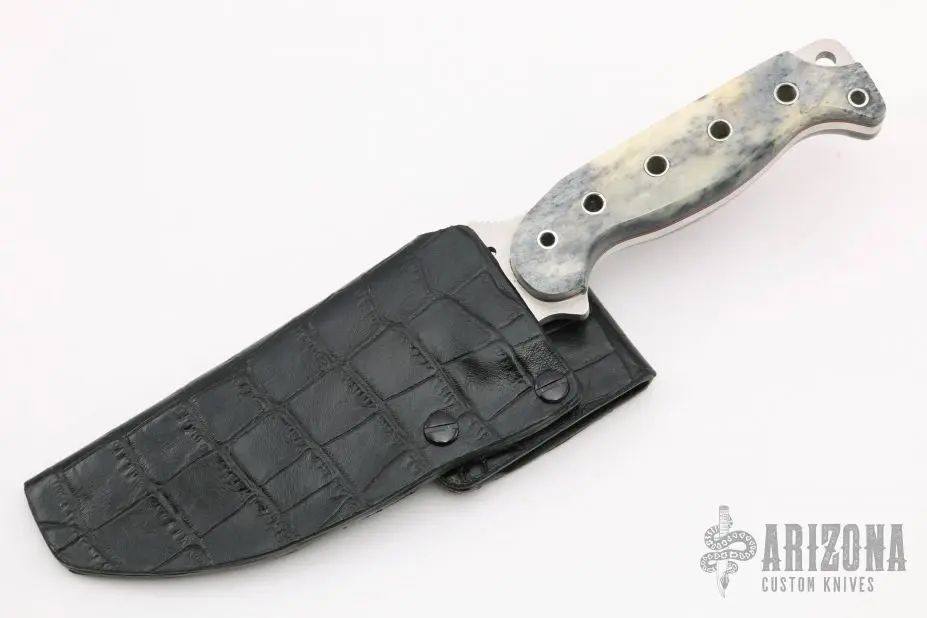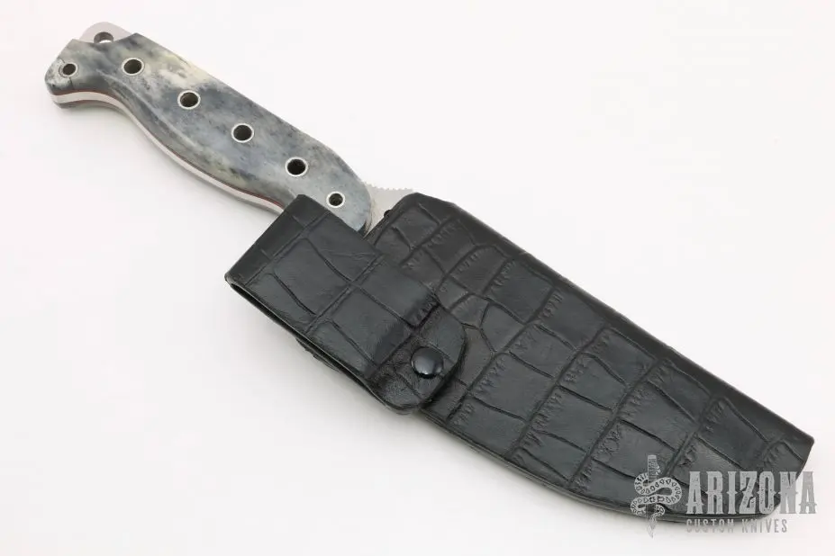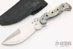 This knife by Boekoe Knives features a satin finished blade with false top edge and notched thumbrest, .191″ blade stock and 1.806″ blade depth, full tang construction. The handle has bone scales with red/white liners. Comes with a leather over kydex sheath and a zippered case. Excellent condition.