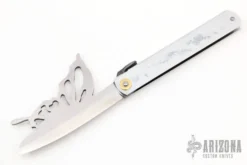 This Cretan by Nikolaos Palamianakis features a mirror polished blade with fileworked spine, .212″ blade stock and 1.080″ blade depth, hidden tang construction. The handle has bone scales and decorative sterling silver bolsters and frame. Comes with a matching sterling silver scabbard with wood interior. New from maker. Blade steel is MOV6-C60. Comes with original box and material sheet from the maker.
