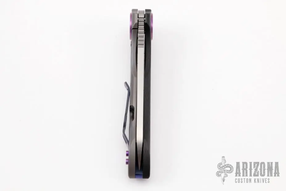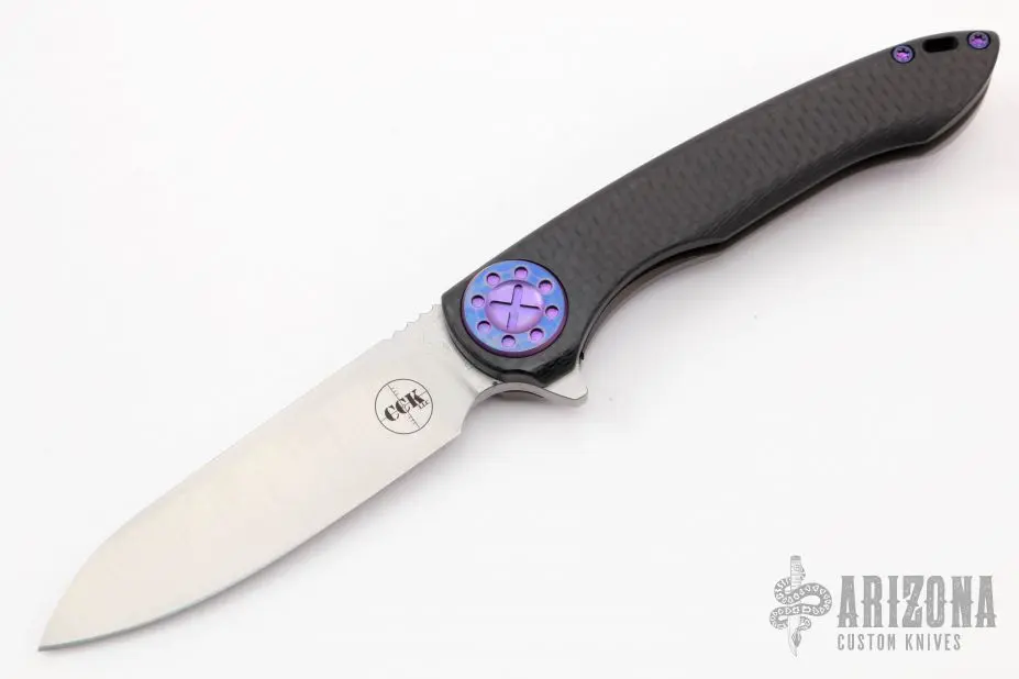 This Cruze frame lock flipper by Curtiss Knives features a satin finished drop point blade with a notched thumbrest and flipper. The handle has a titanium and carbon fiber frame complemented by anodized titanium hardware. Has a couple light scratches, otherwise excellent condition.