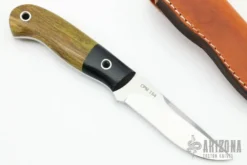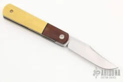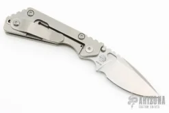This custom Mini Bones flipper from Jeff Park features a hand rubbed, satin finished 154CM blade with flipper. The handle has a milled and two-tone anodized titanium frame, backspacer and tip up clip. Blade is centered when closed, flips well, and locks up with no play. Comes with hard shell case. Has some light carry marks on the frame and clip, otherwise excellent condition.