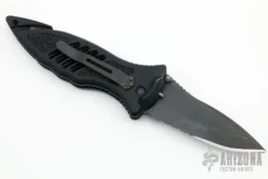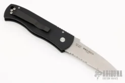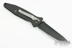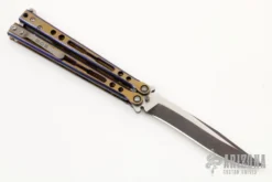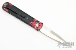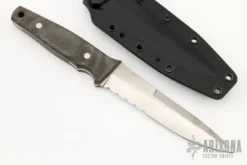 This Custom Sushi Knife by Tommy Chen features a satin finished chisel ground blade, .138″ blade stock and 1.506″ blade depth, full tang construction. The handle has ivory paper micarta bolsters, ironwood scales, carbon fiber pins and green G-10 liners. Somes with a Walnut Scabbard. New from maker.