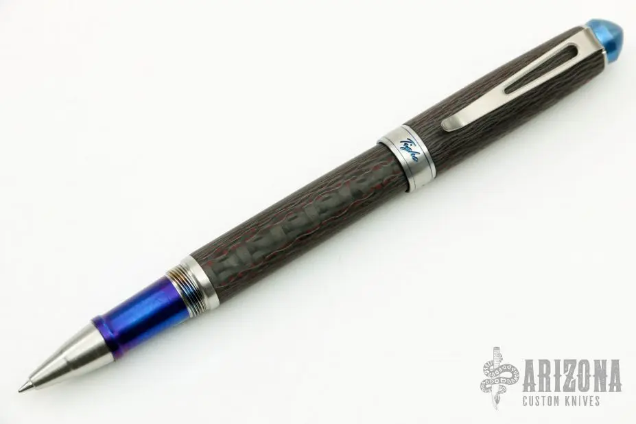 This Custom Screwtop Pen by Grayson Tighe is made from red/black carbon fiber. Solid titanium hardware that has been selectively heat colored. Comes with beautiful presentation box. New from maker. Takes a Schmidt refill.