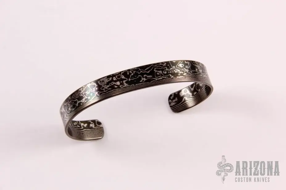This bracelet has a 1.125″ opening and is 3.5″ accross. Brand new from the maker at the 2013 Blade Show.