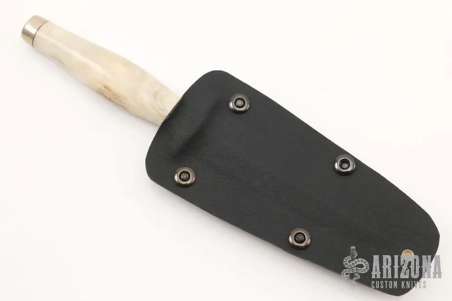 This Dagger by Barrett & Clair features a double edged Damascus blade with .117″ blade stock and .952″ blade depth, hidden tang construction. The handle has a nickel silver guard and butt with a stag grip. Comes with a kydex sheath with boot clip. Excellent condition.