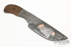 This hunter by Tom Cristel features a Turkish Twist Damascus blade (made by the maker) with .145″ blade stock and 1.169″ blade depth, full tapered tang construction. The handle has a brass guard and black/green linen micarta scales with red liners and brass pins. Comes with a leather sheath. New from maker.