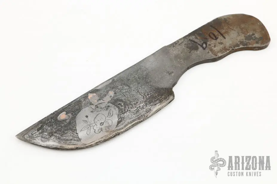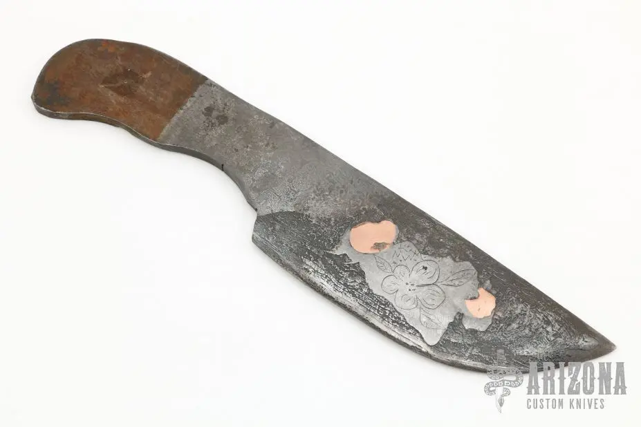 This knife blank from Miles Martin features a Damascus blade with copper forged into the blade. .236″ Blade Stock. 1.816″ Blade Depth. Hardened to R61, soft back, cryo cold treated, double temper. New from maker.