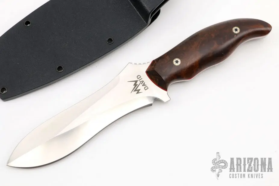 This David by Mercworx has a hand rub satin finished blade with false top edge, notched thumbrest, . 206″ blade stock and 1.622″ blade depth, full tang construction. The handle has desert ironwood burl scales with mosaic pins and red liners. Comes with a kydex sheath. Has a couple light scuffs. Excellent condition.