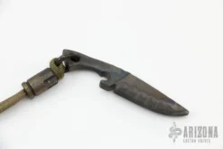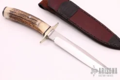 This Defender Prototype by John Young features a mirror finished double-edged blade, .193″ blade stock and .921″ blade depth, full tapered tang construction. The handle has mirror polished stainless steel guard, black linen micarta scales with red liners. Comes with a black leather sheath. Excellent condition.