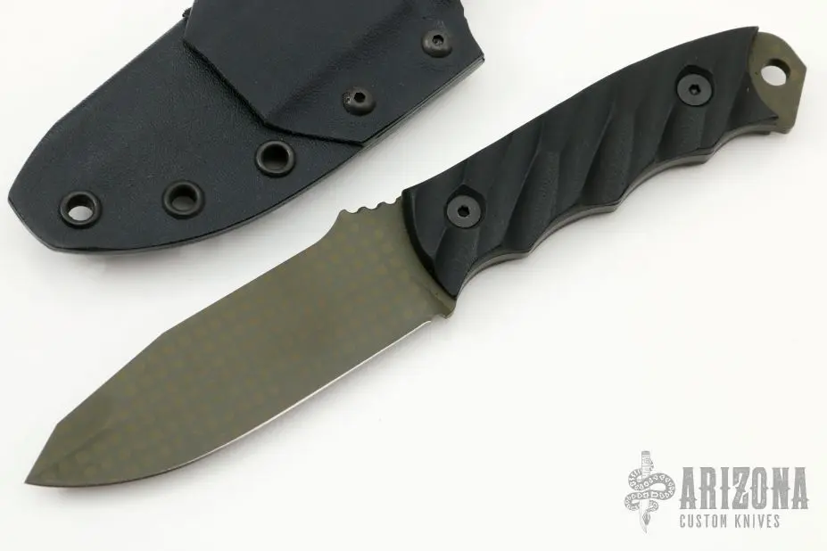 This Crow Jr by Half Face Blades features a green camo cerakoted drop point blade with a full tang construction. Â .155″ Blade Stock. Â 1.2″ Blade Depth. Â The handle is composed of contoured G-10 scales. Â Comes with a kydex sheath. Â Has some sheath marks otherwise excellent condition. Â Â