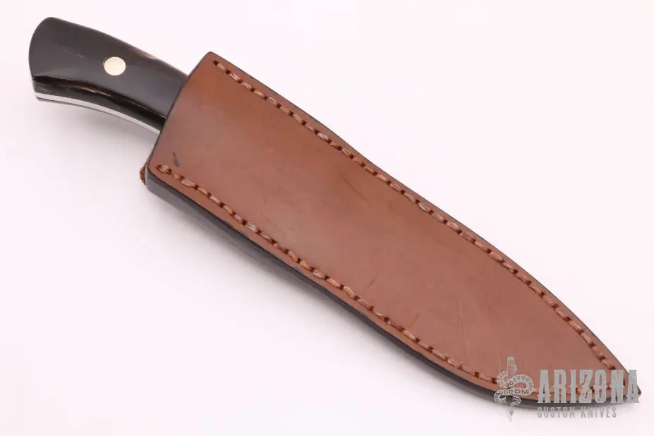 This fixed blade by Jim Ort of OZ Knives features a satin finished blade with 0.172″ blade depth and 1.244″ blade depth, full tang construction. The handle stainless steel bolsters, buffalo horn scales. Comes with a brown leather sheath with belt loop. Has a few light scratches, otherwise excellent condition.