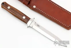 This knife by Dan Dugdale features a hand rub satin finished blade with .126″ blade stock and .995″ blade depth, full tang construction. The handle has stainless steel boslters, black/blue G-10 scales, lanyard hole at the butt. Comes with a hand tooled brown leather sheath. Has a rust spot on the back of the blade, otherwise good condition.