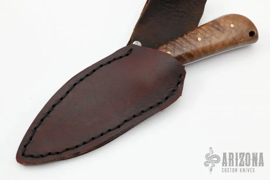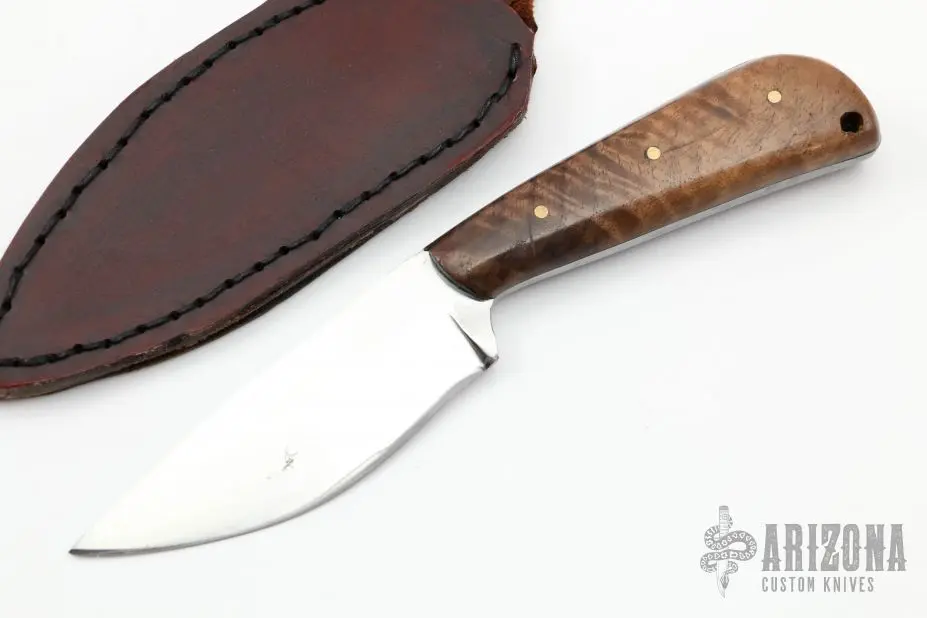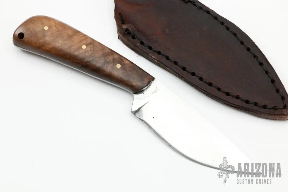 This skinner by Mike Cash features a mirror finished blade with .183″ blade stock and 1.24″ blade depth, full tang construction. The handle has a walnut burl scales. Comes with a brown leather sheath. New from maker.Â