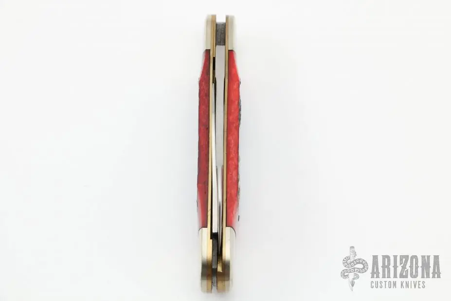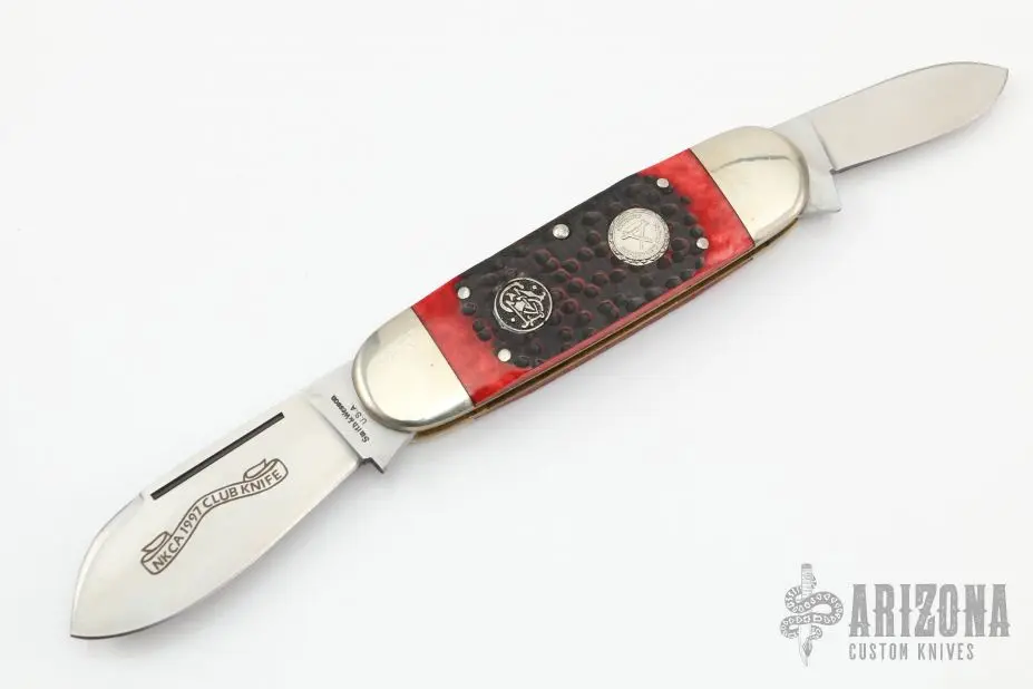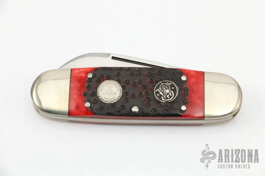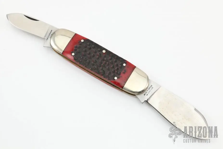 This Elephant Toe slipjoint by Case Knives has two satin finished blades both with nail nicks. The handle has nickel silver bolsters, dyed bone covers, brass liners and pins, stainless steel spring.Comes with original box. Excellent Condition. Â