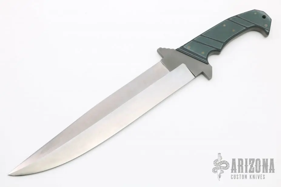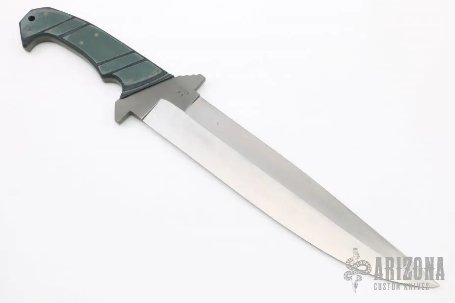 This F1 Fighter by Wally Hayes features a satin finished double edged blade with .241″ blade stock and 1.825″ blade depth, full tang construction with black/green G-10 scales. Has a few light scuffs/scratches, otherwise excellent condition.