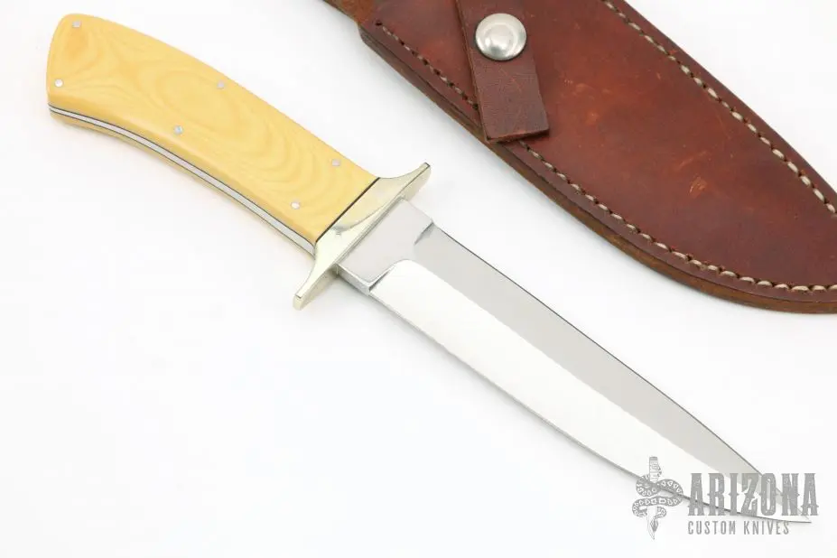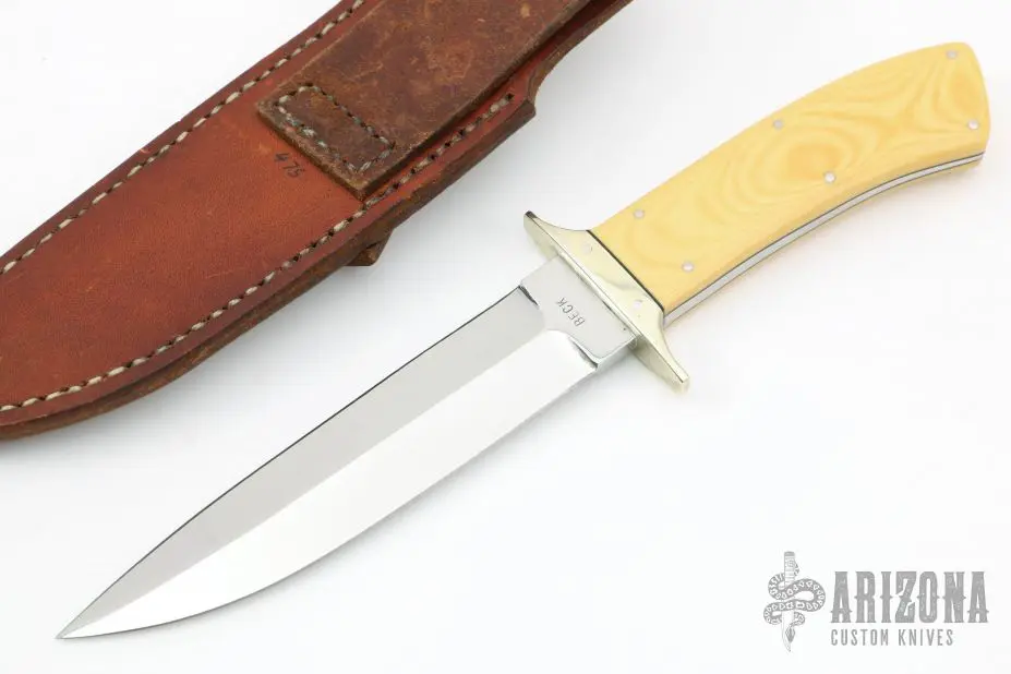 This Fighter by PF Beck features a mirror polished double edged blade with .202″ blade stock and 1.173″ blade depth, full tapered tang construction. The handle has a nickel silver guard, yellow paper micarta scales with black liners. Comes with a brown leather sheath. Has a few light scratches, otherwise excellent condition. #475 on underside of ricasso.