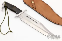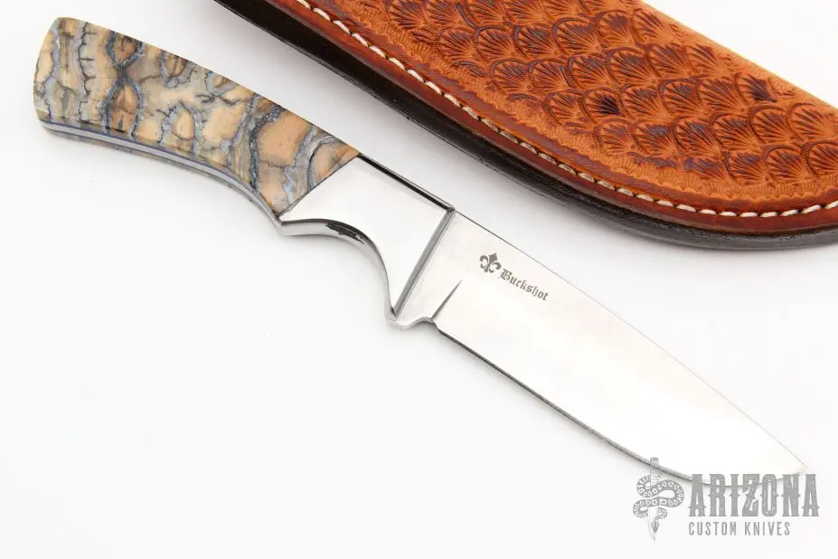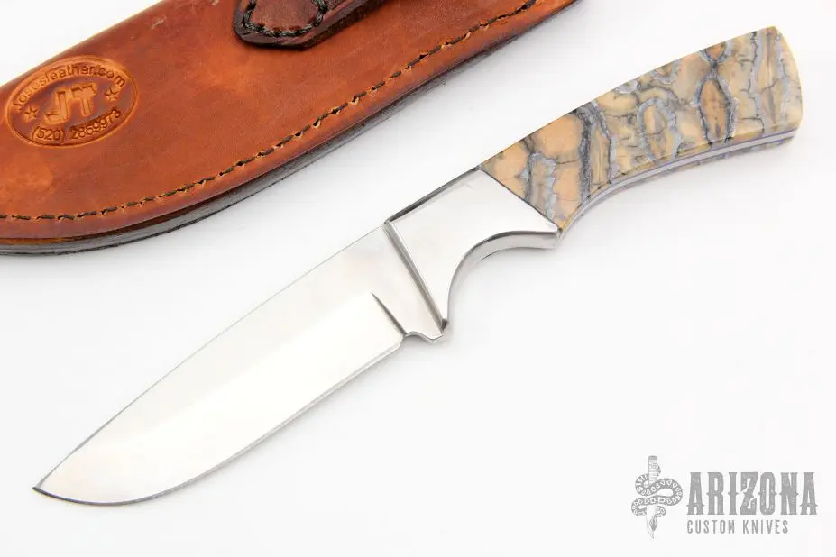 This custom fixed blade features a mirror polished drop point blade with a full tang construction. Â .126″ Blade Stock. Â 1.033″ Blade Depth. Â The handle features steel bolsters, mammoth tooth scales and blue lines. New from maker.