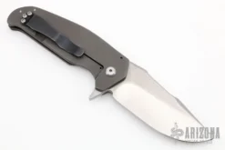 This knife by A&R features a stainless Damascus blade with fullers, .094″ blade stock and .839″ blade depth, hidden tang construction. The handle has a notched stainless steel guard and birch wood grip. Comes with a black leather sheath and a zippered case. Excellent condition.