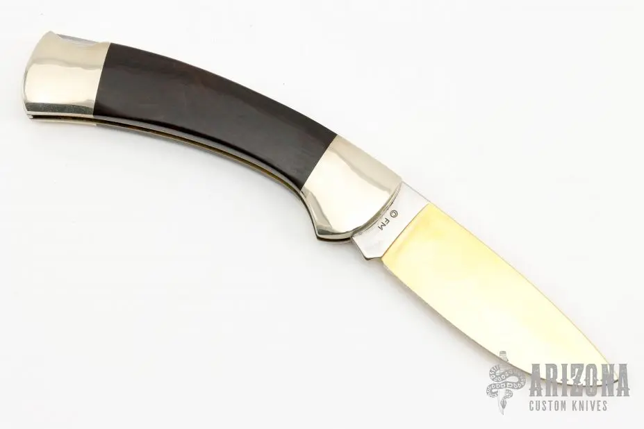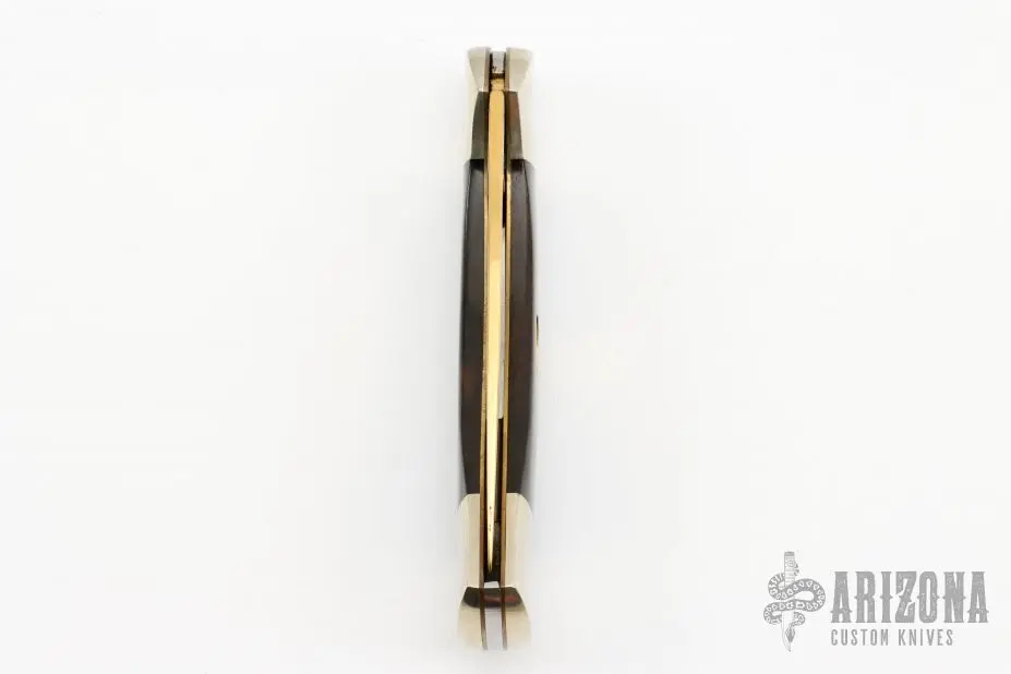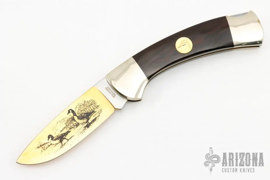 The Franklin Mint Wildlife Series was manufactured by Boker. This one has a drop point gold plated blade with an image of geese. The handle has nickel silver bolsters, cocobolo scales, brass liners and stainless steel backspacer. Excellent condition.