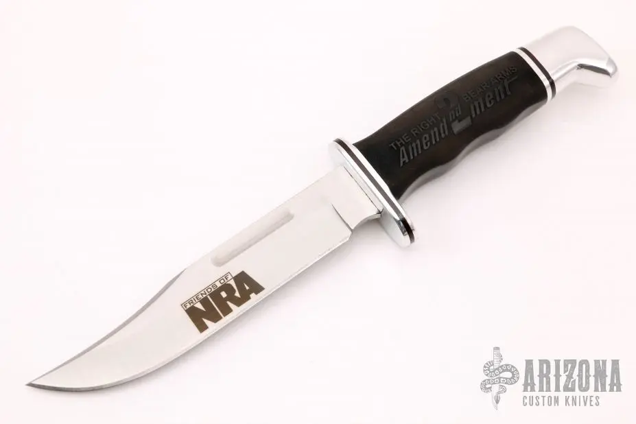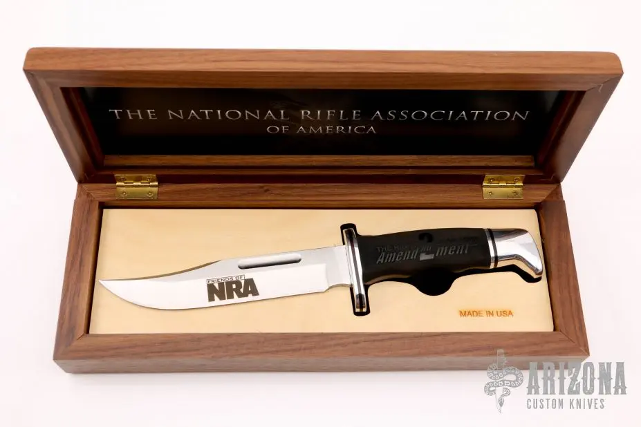 This Model 120 by Buck Knives features a satin finished clip point blade with false top edge and fullers, .175″ blade stock and 1.066″ blade depth, hidden tang construction. The handle has an aluminum guard and butt, and a black grip. Comes with original wooden display box. Excellent condition.Â