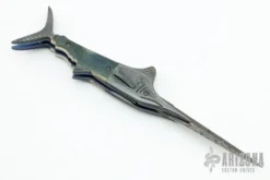 This Framelock Flipper by Flavio Ikoma features a Damascus blade with notched thumbrest and flipper. The handle has a carved titanium frame with anodized reliefs, super conductor inlays, matching tip up clip with carving, black G-10 backspace with super conductor inlay. Frame has been milled from the inside to reduce the weight, inside of frame has also been jeweled. Rides on IKBS, nice detent, lockup and blade seating. #003 on the blade. Comes with a Velcro case. Excellent condition.