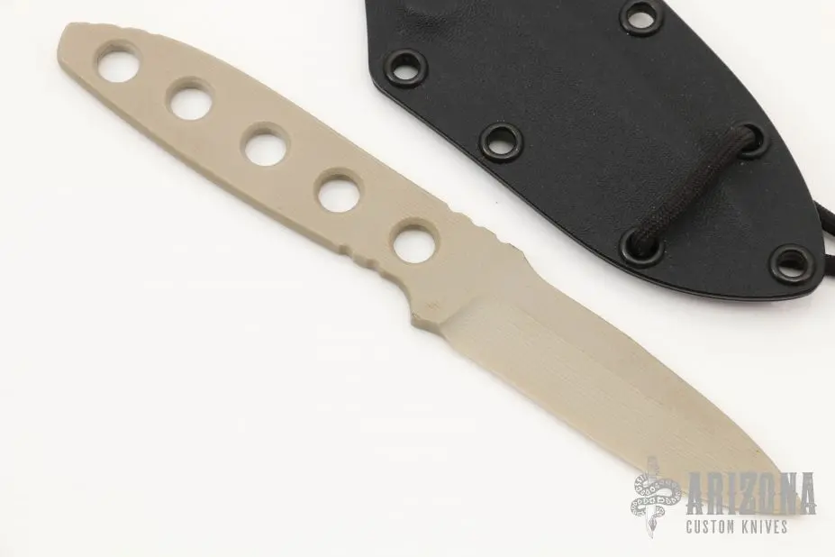 This neck knife by Shane Sibert features a G-10 blade with an integral construction. Â .203″ Blade Stock. Â 1.024″ Blade Depth. Â Includes a black kydex sheath. Â Excellent condition. Â