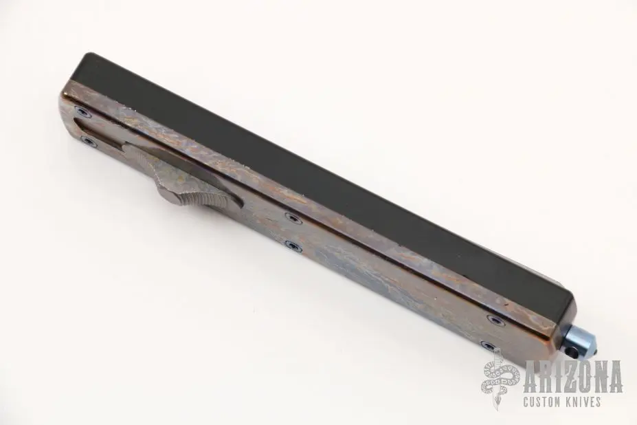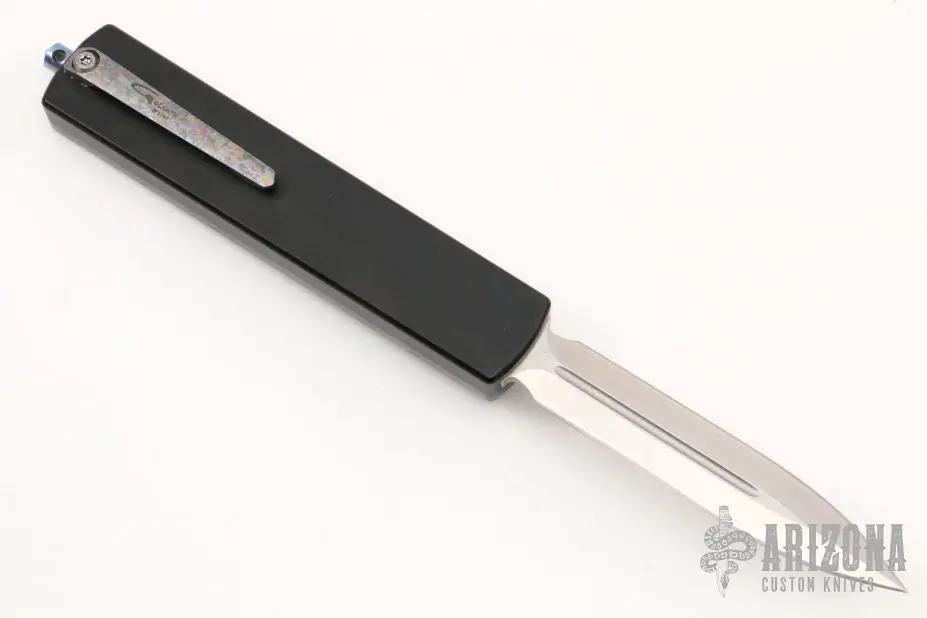 This G12 OTF Auto by Golgoth Knives features a satin finished double edged blade with fullers. The handle has a black aluminum chassis with anodized titanium top, anodized titanium hardware, tip down titanium clip. Comes with velcro case. New from maker at the 2022 USN Gathering. #1747